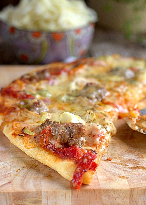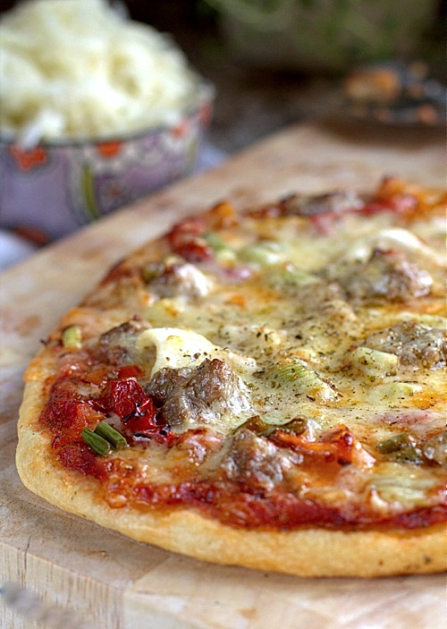 Pizza kebab to po prostu pizza z mięsem kebab i dodatkami. Dzisiaj skusiłam się na grillowaną paprykę i cebulę dymkę. Pycha!