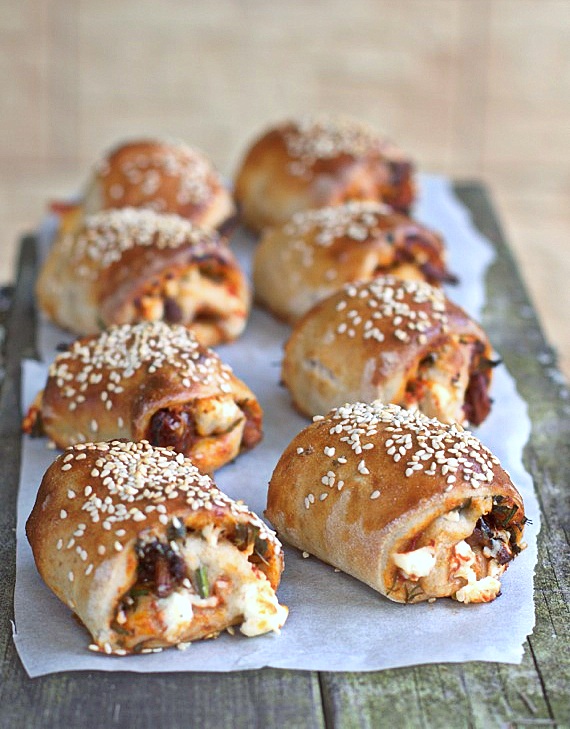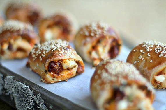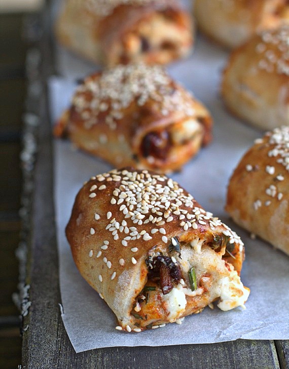 Rozwałkuj ciasto w prostokąt i przetnij na 3 podłużne pasy. Posmaruj pomidorowym sosem. Na wierzchu ułóż na kurki, pokrojone suszone pomidory i pokruszoną feta. Całość posyp parmezanem. Każdy pas zroluj i potnij na 8 kawałków. Posmaruj pizza bułeczki rozmąconym jajkiem i posyp sezamem. Piecz bułeczki na 200ºC na termoobiegu (225 bez termoobiegu) przez około 10 minut, aż będą rumiane.