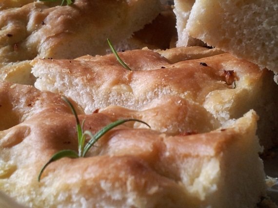 Focaccia to płaski włoski chlebek, który przed pieczeniem dziurawi się palcami i polewa się obficie oliwą z oliwek. Chlebek ma lekko chrupiącą skórkę, ale jest bardzo mięciutki w środku i bardzo aromatyczny.