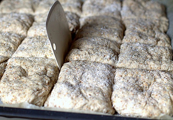 - Podziel ciasto na cztery równe porcje. Rozciągnij na 4 podłużne placki i ułóż obok siebie w małych odstępach, na blasze wyłożonej pergaminem. Łopatką do chleba podziel placki, oprósz otrębami, przykryj folią i pozostaw do wyrośnięcia na godzinę.