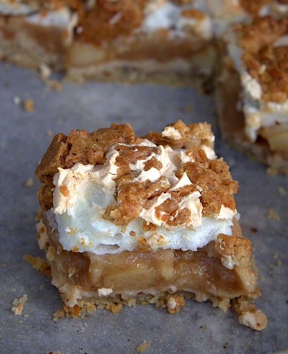 - Ubij pianę na sztywno, a potem dodaj oba cukry i ubijaj dopóki cukier się nie rozpuści. Rozprowadź bezę na jabłkach, a na końcu zetrzyj resztę ciasta kruchego.