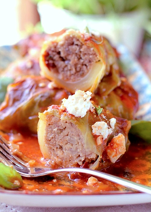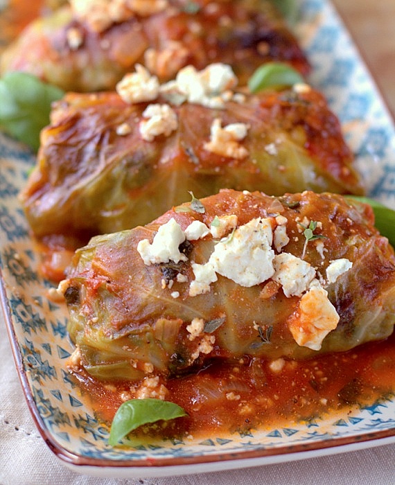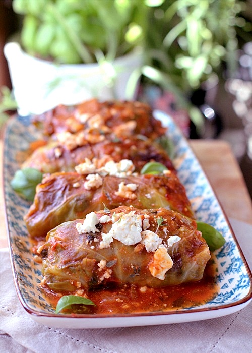 Zalej gołąbki sosem posyp pokruszoną feta i zapiecz w piekarniku na termoobiegu na 160ºC przez około 30 minut. Podawaj na ciepło obficie polane sosem.