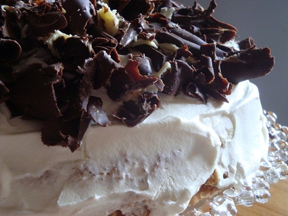 - Posmaruj wierzch tortu kremem, a potem cały tort bitą śmietaną.