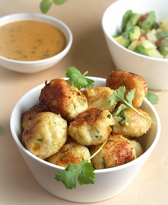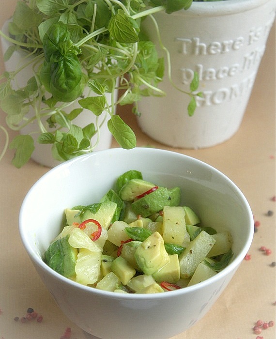 Rybne klopsiki świetnie pasują z salsa, którą zrobiłam z ananasa i awokado z dodatkiem chili, liści bazylii i mięty pieprzowej. Całość skropiłam sokiem z limonki i doprawiłam czarnym i różowym pieprzem.
