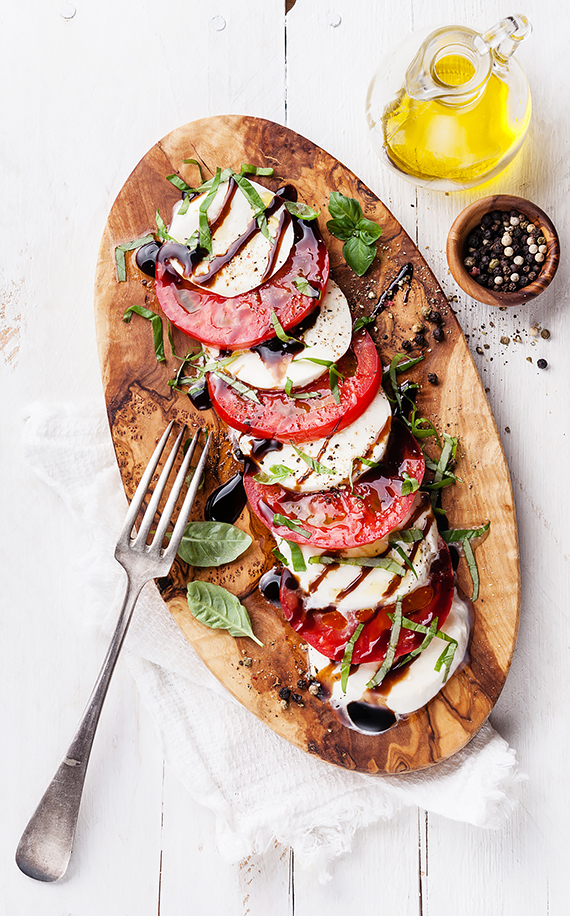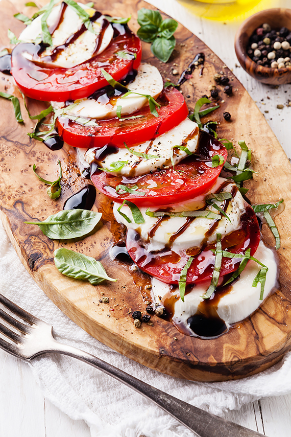Pokrój pomidora i mozzarella w grube plastry i ułóż na desce lub talerzu. Posyp pieprzem, solą, pokrojoną bazylią , Skrop oliwą i balsamicznym octem. Smacznego!