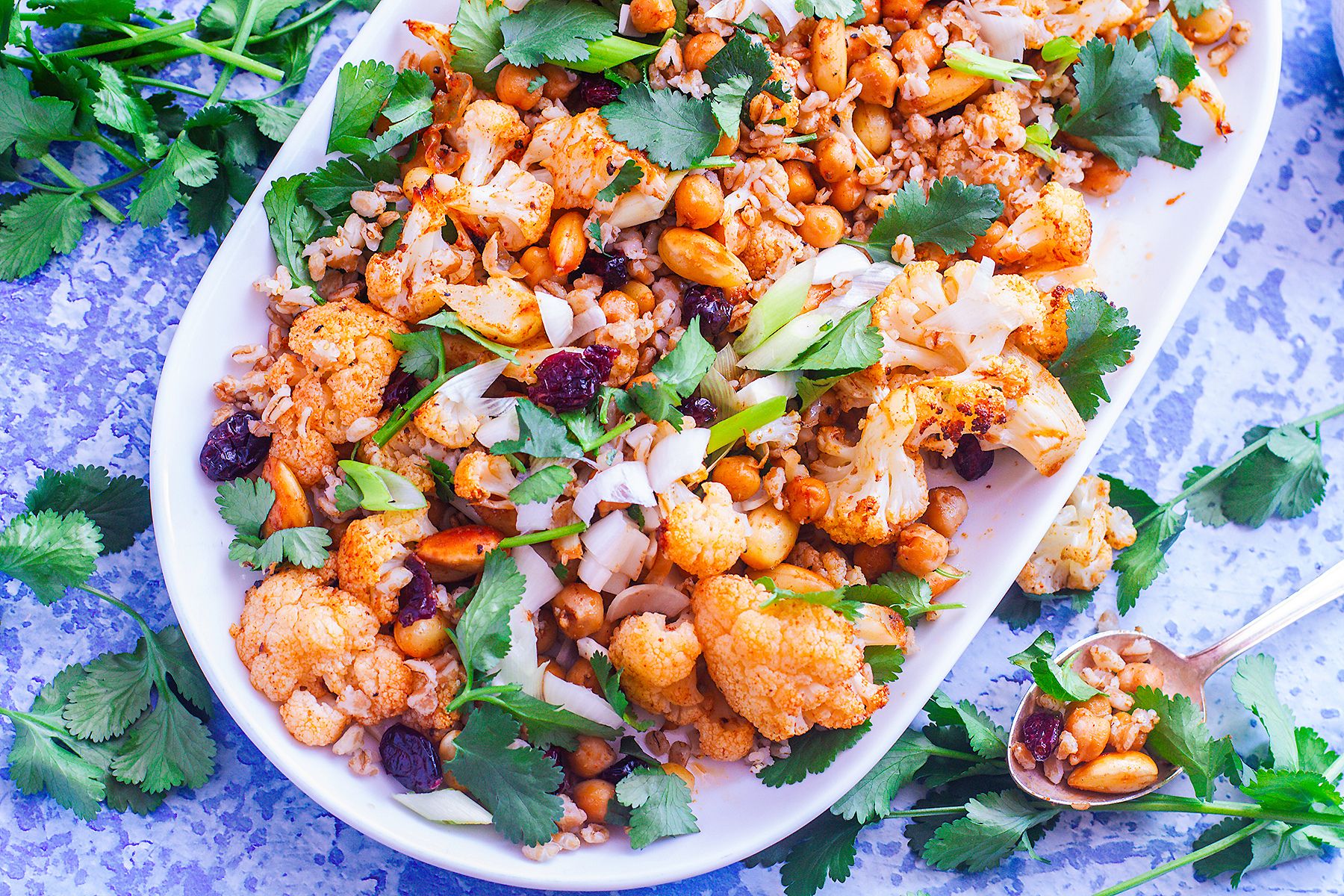 - Wymieszać pieczone składniki z pszenicą, kolendrą, dymką i żurawiną. Przed podaniem polać dressingiem. Smacznego!