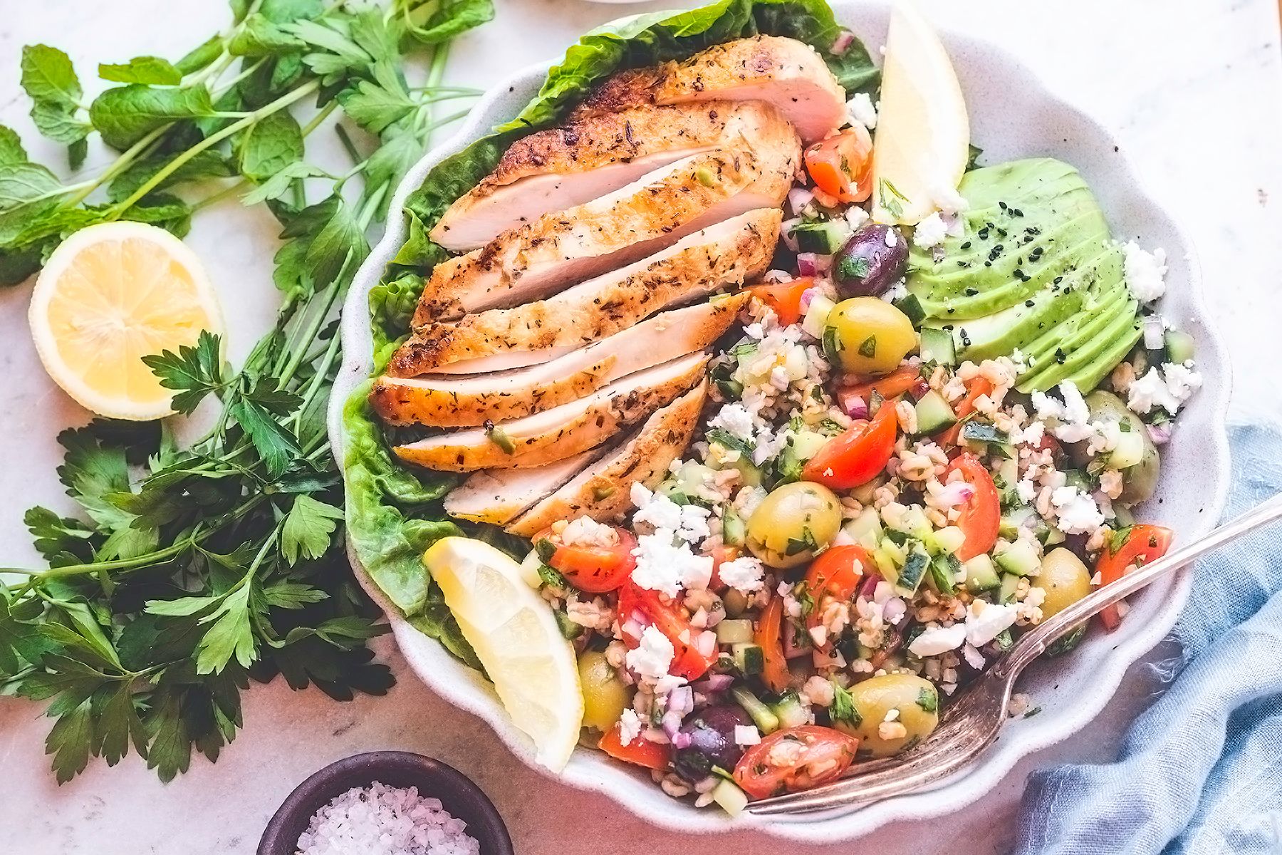 - Posypać sałatkę pokruszonym serem feta i obłożyć kurczakiem oraz awokado. Smacznego!