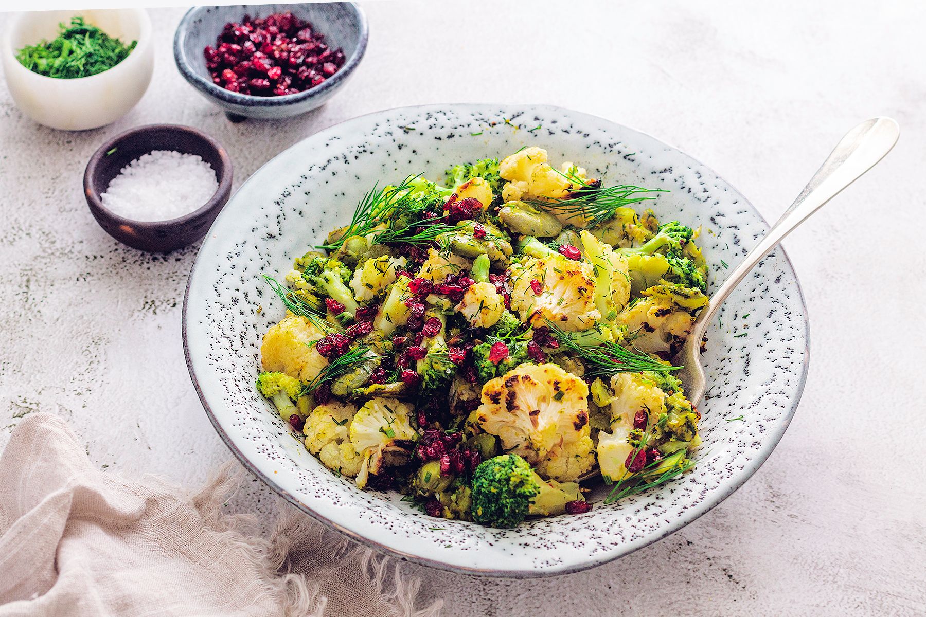 - Kalafior i brokuły podzielić na różyczki, rozłożyć na blasze, skropić oliwą, oprószyć solą i płatkami chili. Wstawić do piekarnika nagrzanego do 225°C z funkcją grilla. Piec przez około 20 minut, aż warzywa lekko się zarumienią. Przełożyć na talerz.