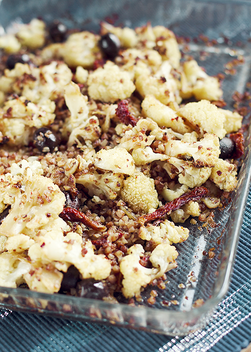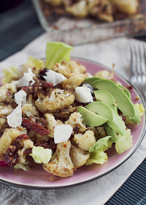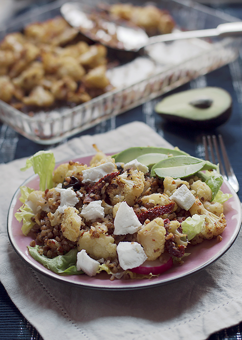 Ugotuj kaszę w lekko osolonej wodzie. Na patelni rozgrzej oliwę i lekko zrumień czosnek pokrojony w plasterki. Dodaj kaszę i smaż przez chwilę. Następnie dodaj pokrojone w paski suszone pomidory i oliwki. Dopraw solą i pieprzem. Teraz dodaj kalafior i lekko wymieszaj. Podaj sałatkę z zieloną sałatą, awokado i chevré.