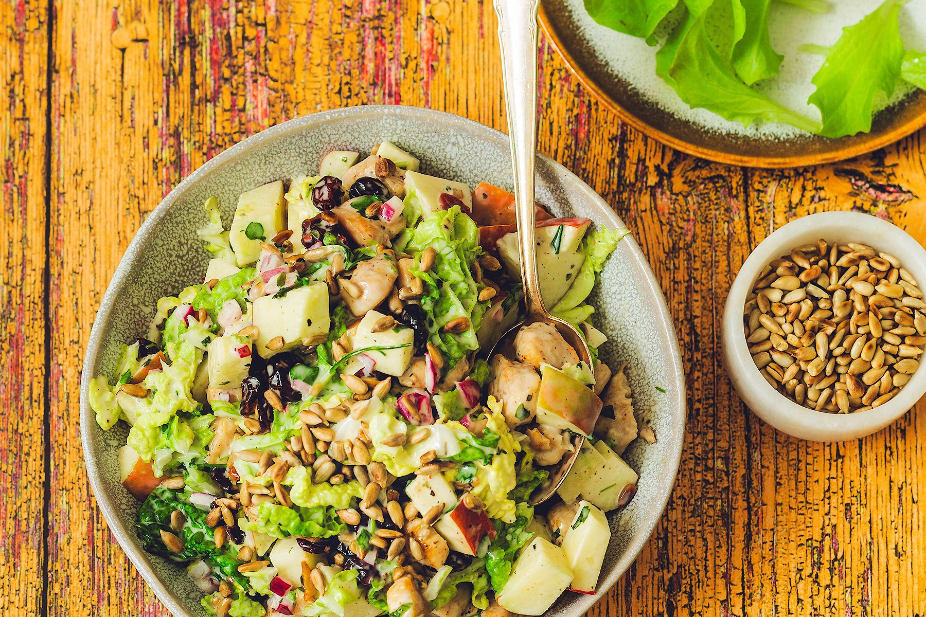 Ta sałatka z kapusty pekińskiej i kurczaka to pyszne połączenie soczystego mięsa, chrupiącej kapusty, prażonego słonecznika, suszonej żurawinyi słodkich jabłek. Wszystko to otulone kremowym sosem na bazie majonezu z nutą soku z limonki i miodu. To szybki i prosty przepis na lunch – gotowy w 15 minut, idealny zwłaszcza gdy korzystasz z resztek pieczonego kurczaka z obiadu.
