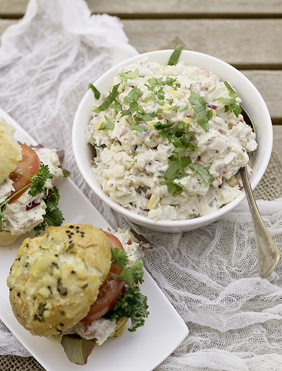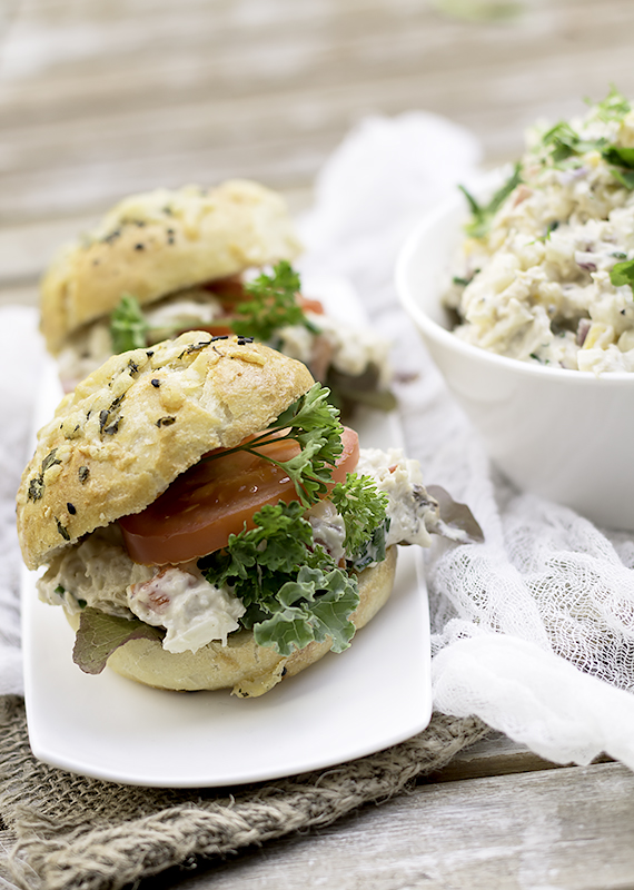 Sałatka na bazie majonezu to fajne nadzienie do kanapek. Bułeczki serowe świetnie się nadają do tego celu.