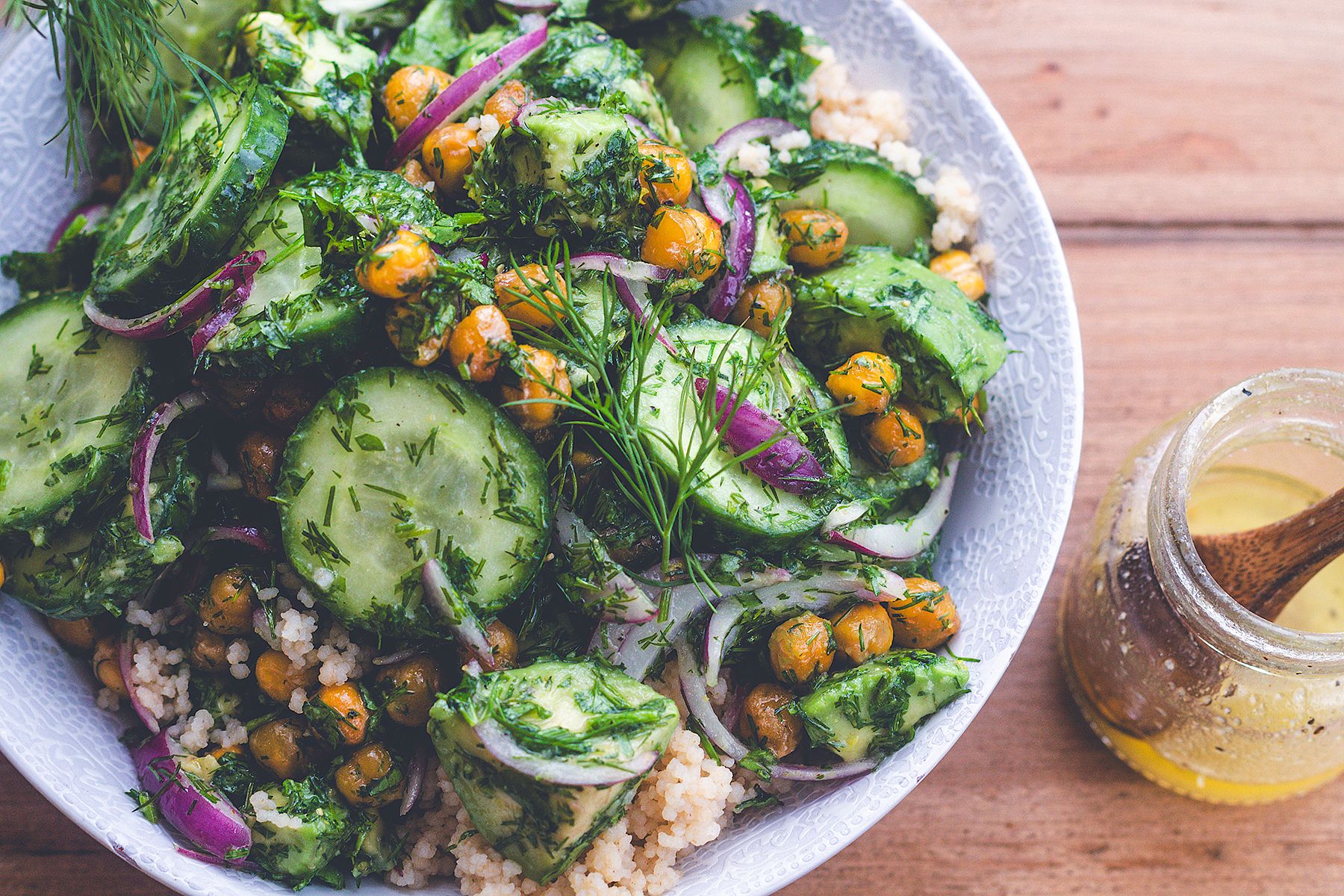 - Do warzyw i ziół dodać ciecierzycę i wlać dressing. Wymieszać sałatkę i podać na spodzie z pełnoziarnistego couscous. Smacznego!