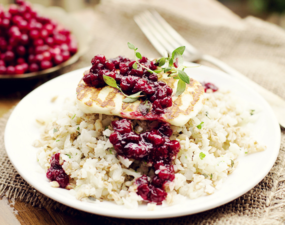 Ugotuj pęczak na sypko w lekko osolonej wodzie. Zetrzyj kalafior na tarce o dużych oczkach. Wrzuć do garnka i zalej wodą, lekko posól. Blaszuj kalafior przez 3 miuty, po czym odcedź. Wymieszaj pęczak z kalafiorem i ziołami. Pokrój halloumi w plasterki i ugrilluj na grillowej patelni . Ułóż na kaszy wymieszanej z kalafiorem. Całość polej karmelizowanymi borówkami lub dżemem z borówek