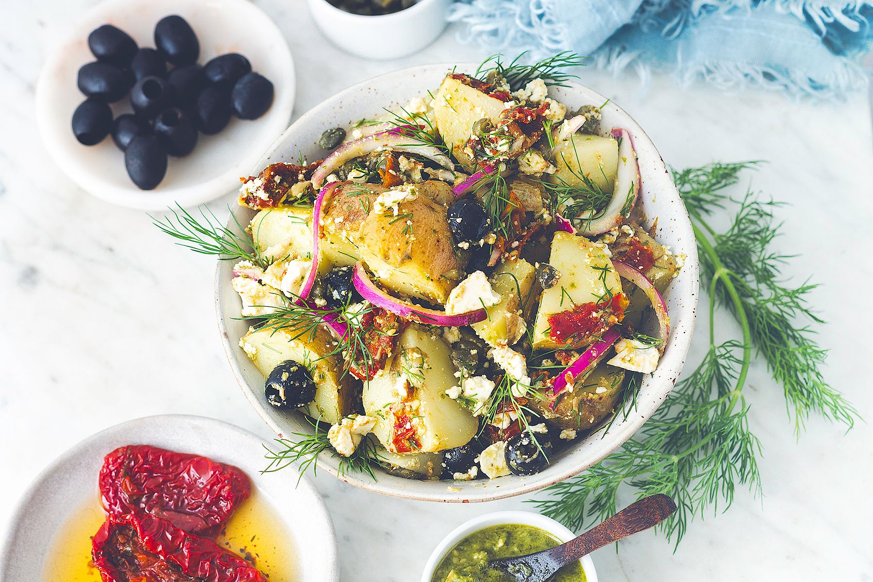 Pyszna sałatka z ziemniaków, oliwek, kaparów, suszonych pomidorów i fety… Pewnie pomyślicie: „Czego to tam nie ma?!” – no właśnie! Bo jak dla mnie, im więcej tym lepiej. To taka sałatka w stylu „wrzuć wszystko, co dobre”, a potem tylko ciesz się smakiem.