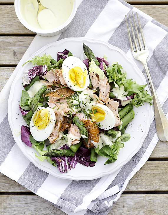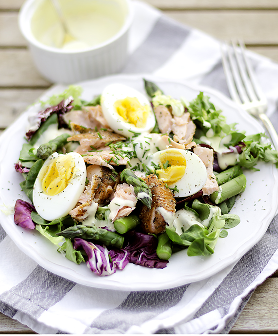 Ugotuj jajka na twardo lub jak ja na pół twardo. Ugotuj szparagi. Jak gotować szparago kliknij tutaj. Majonez wymieszaj z szafranem. Dopraw solą i sokiem z cytryny. Na talerzu ułóż porwaną sałatę, szparagi, kawałki łososia i połówki jajek. Polej sałatkę majonezem i posyp szczypiorkiem i pieprzem.