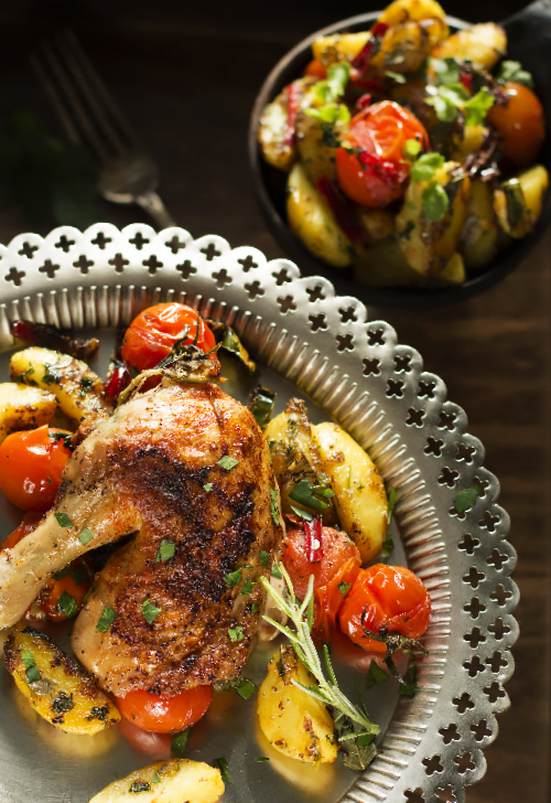 Ugotuj ziemniaki w mundurkach lub wykorzystaj resztki ziemniaków jeśli ugotowane w całości. Pokrój ziemniaki w ósemki. Pokrój chili w krążki. Nasiona przypraw upraż na patelni, po czym zgnieć w moździerzu. Rozgrzej olej na patelni i wrzuć ziemniaki, chili i przyprawy. W rękach rozetrzyj suszone liście curry i dodaj do ziemniaków. W tym samym czasie upiecz pomidorki w piekarniku. Dodaj pomidory do sałatki, posiekany koriander i przypraw solą. Podaj sałatkę do sztuki mięsa np. do kurczaka.
