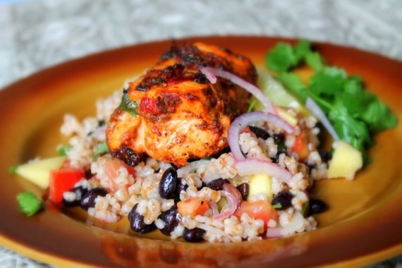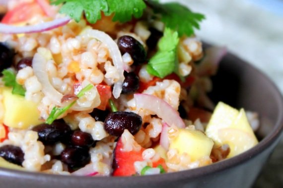 Wegetarianska salatka z pszenicy, czarnej fasoli i mango