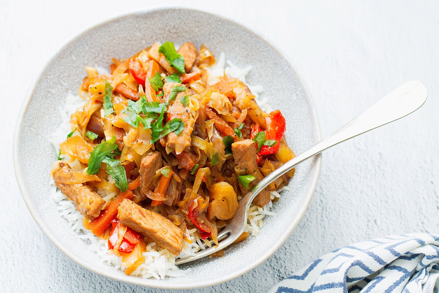 Na koniec dodaję zrumienione kawałki schabu i łączę z kapustą. Potem pozostaje ugotowanie ryżu. U mnie jest to zazwyczaj basmati.