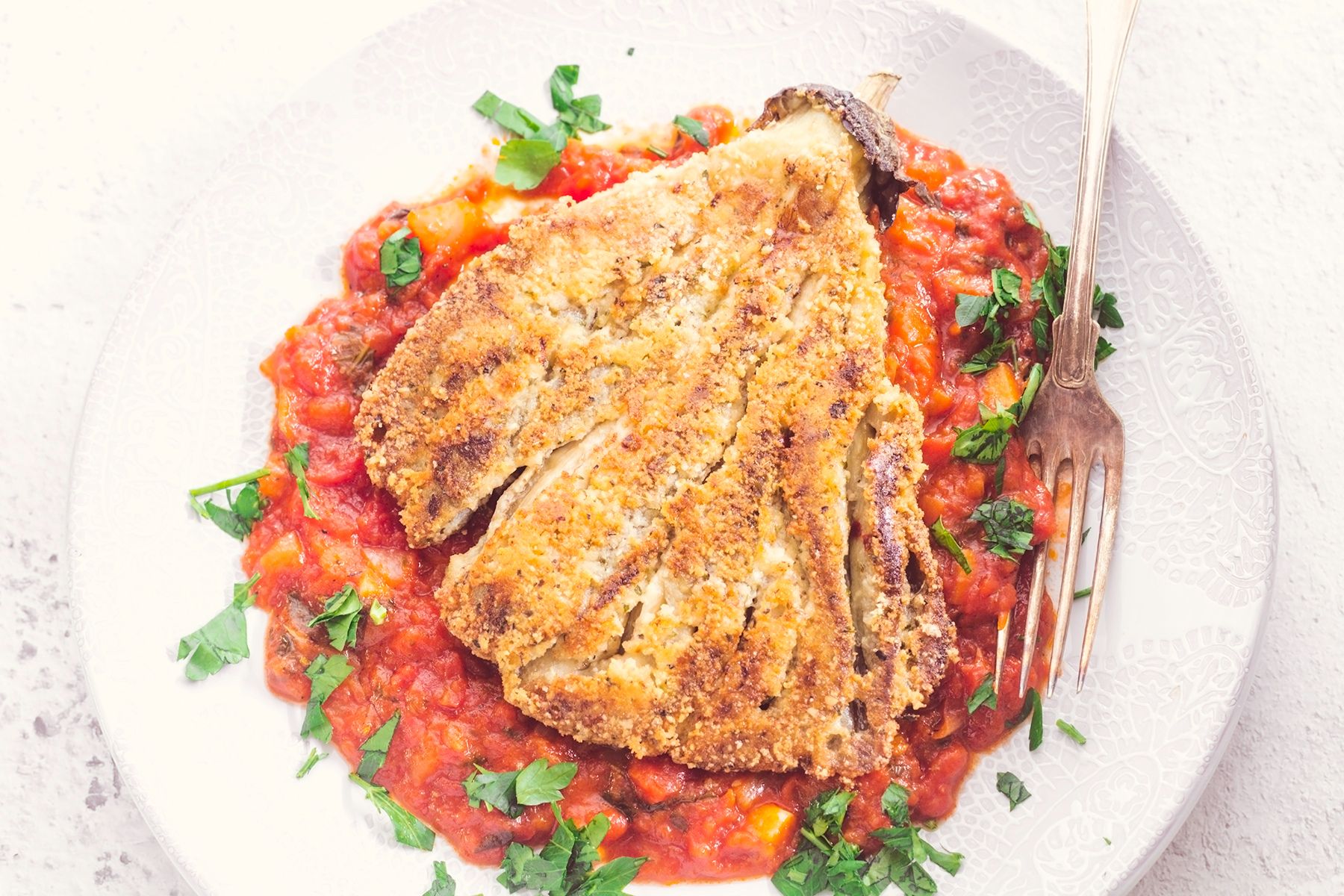 - Podać schabowy z bakłażana z sosem pomidorowym. Posypać zieleniną. Smacznego!