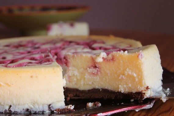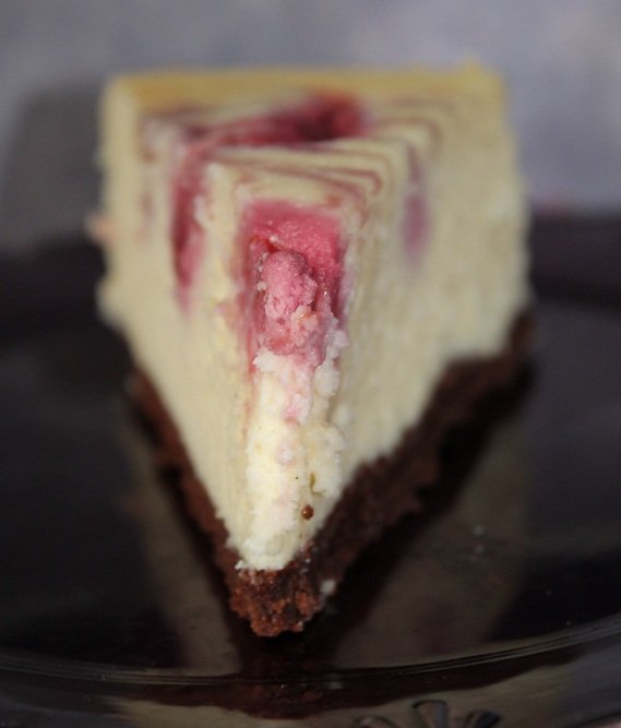 Wszystkie składniki na sernik muszą mieć temperaturę pokojową. Szczelną tortownicę o średnicy 28 cm z odpinaną obręczą wyłożyć pergaminem lub posmarować tłuszczem. Aby zapobiec przeciekaniu wody owinąć tortownicę dodatkowo folią aluminową. Moja tortownica tego nie potrzebowała. Wymieszać rozpuszczoną, lekko schłodzoną czekoladę z masłem, następnie dodać mąkę. Wreszcie, wmieszać lekko roztrzepane jajko. Wszystko robimy manualnie. Wlać ciasto brownie do tortownicy i piec na 160 ºC (termoobieg) przez 6 minut. Tymczasem lekko wymieszać oba sery z mąką ziemniaczaną, wanilią i cukrem. Użyć miksera na niskich obrotach. Nie napowietrzać masy serowej. Dodawać po jednym jajku, ubijając lekko. Wymieszać maliny z cukrem, zmiksować i przetrzeć przez sito w celu pozbycia się pestek. Wylać masę serową na czekoladowy spód brownie, wygładzić powierzchnię sernika. Na wierzch masy serowej wykładać po łyżeczce musu malinowego, tak aby nie zatonął. Cieniutkim patyczkiem rozprowadzić mus malinowy po powierzchni w fantazyjne wzorki. Wstaw tortownicę z ciastem do większej formie, która pomieści 1 litr wody plus tortownicę. Wlej gorącą wodę. Piec sernik w piekarniku na 160°C (termoobieg) przez 15 minut. Potem obniżyć temperaturę do 120°C, bez otwierania piekarnika i piec jeszcze około 90 minut. Po tym czasie wyłączyć piekarnik i pozostawić ciasto w piekarniku z uchylonymi drzwiczkami do wystygnięcia wody. Wyjąć ciasto, ostudzić w temperaturze pokojowej jeśli jest jeszcze za ciepłe i wstawić do lodówki na co najmniej 8 godzin.