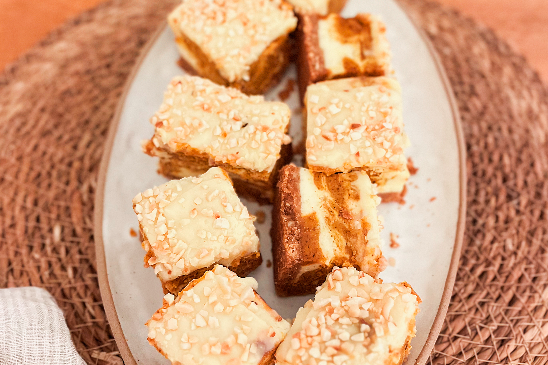 - W drugiej misce wymieszać dyniowe purée z rozpuszczonym olejem kokosowym, cukrem, jogurtem i przyprawami. Dodać jedną trzecią białej masy serowej i wymieszać. Nakładać obie masy na schłodzony spód na przemian — tak jak pokazałam na Instagramie. Wstawić sernik do piekarnika nagrzanego do 180ºC i piec przez 45 minut. Wyjąć i ostudzić.