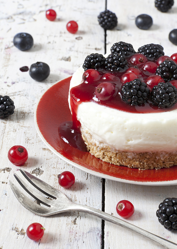 Schłodzone serniki wyjmij z lodówki. Delikatnie zdejmij metalowe obręcze. Do 150 g mieszanych owoców jagodowych dodaj cukier i zmiksuj. Tak powstały sos można przetrzeć przez sito. Podgrzej sos i dodaj odciśniętą żelatynę. Wstaw sos do lodówki do schłodzenia. Polej sosem serniczki, a na wierzchu ułóż świeże owoce.