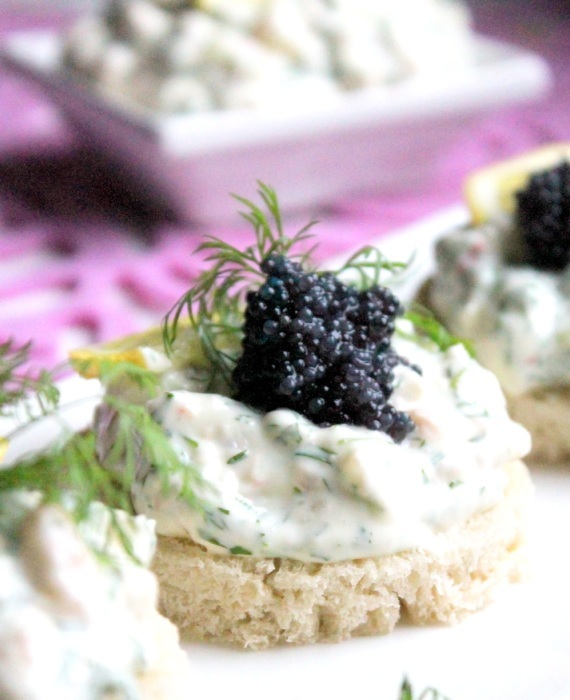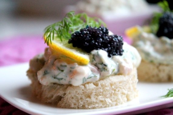 Krewetki siekamy na drobno wraz z koprem. Mieszamy z majonezem i creme fraiche, doprawiamy solą. Sałatkę można podać w miseczce lub zrobić małe kanapki jak na zdjęciu powyżej.