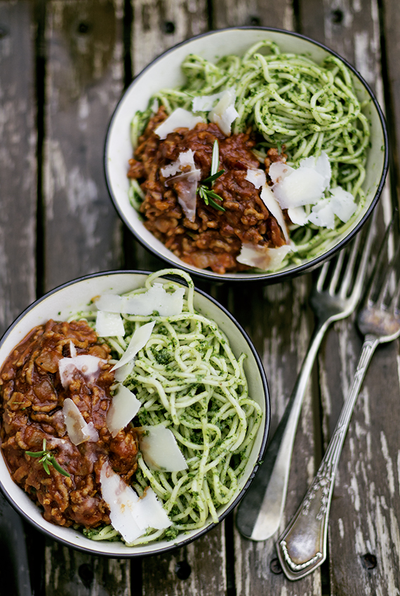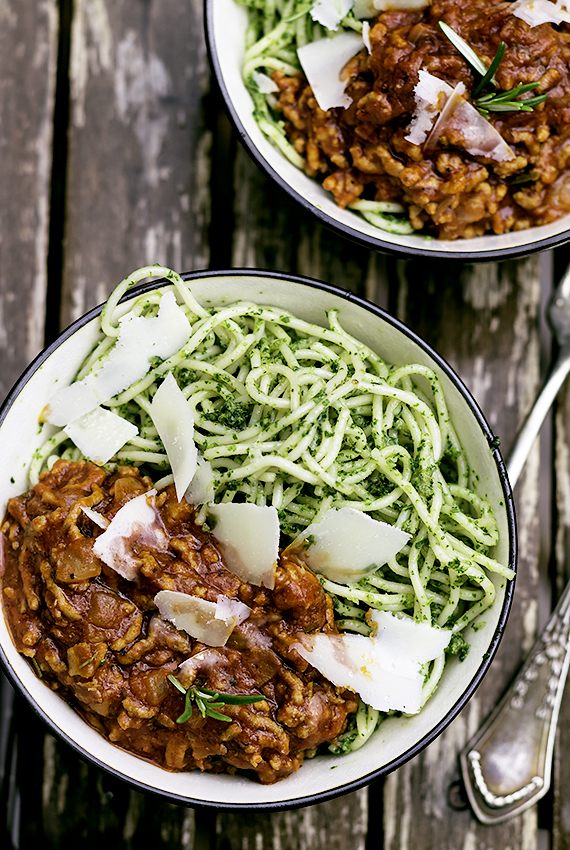 Pokrój cebulę w kostkę i zeszklij na oleju. Dodaj pokrojony boczek i smaż aż boczek lekko się zrumieni. Dodaj teraz mięso, przyprawy i rozmaryn. Smaż aż mięso przestanie być krwiste po czym dodaj pomidory, przecier i bulion. Gotuj sos przez 20 minut. Na koniec dopraw solą. Ugotuj spaghetti al dente w lekko osolonej wodzie. Przygotuj pesto według przepisu, kliknij w link. Wymieszaj makaron z pesto i podaj z gotowym sosem posypanym parmezanem.