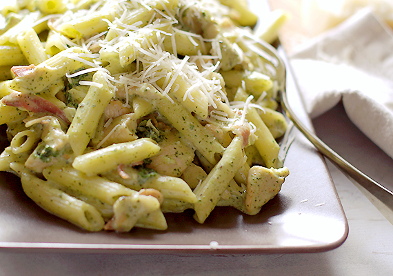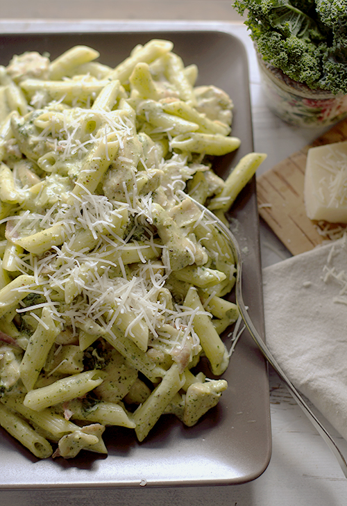Pierwsza porcja jarmużu wykorzystana. Zrobiłam pesto z jarmużu, które używam po prostu do wszystkiego. Dzisiaj zrobiłam sos do makaronu z jarmużowego pesto i kurczakiem. Jest to sos na bazie beszamelu, bardzo kremowy, po prostu idealny do makaronu. Bardzo polecam ten przepis z jarmużem. Sos do makaronu jest bardzo delikatny w smaku i na pewno przypadnie do smaku nawet dzieciom. Jeśli lubicie to warzywo to zachęcam Was do ugotowania minestrone z jarmużem.