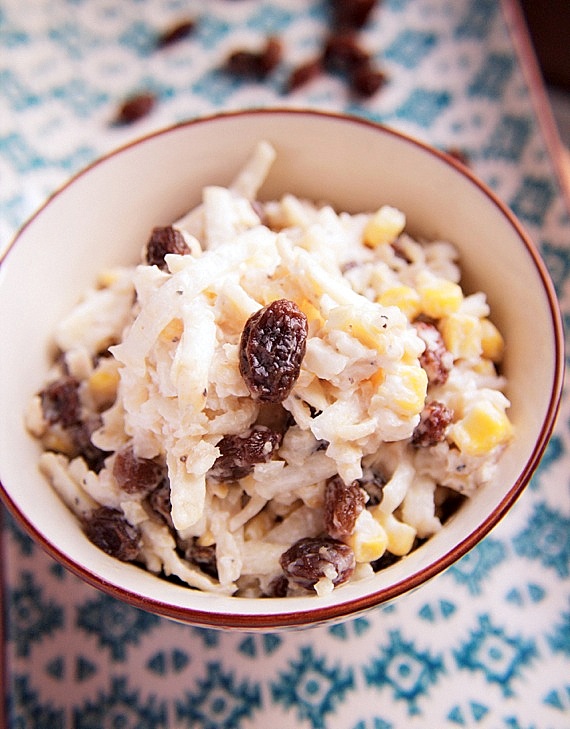 Do surówki użyłam korzeń selera, ale surówkę można zrobić wykorzystując również nać selera. Rodzynki i kukurydza świetnie komponują się ze smakiem selera.