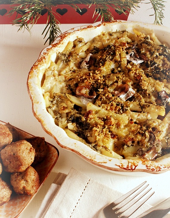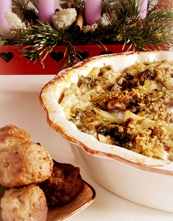 Świąteczna zapiekanka z ziemniaków i anchois to typowe szwedzkie danie podawane podczas Bożego Narodzenia. Na to proste danie składają się ziemniaki pokrojone w słupki jak frytki, anchois, cebula i śmietana. Całość przed zapieczeniem posypuje się tartą bułką. Bardzo smaczna zapiekanka, które pasuje to ryby i mięsa.