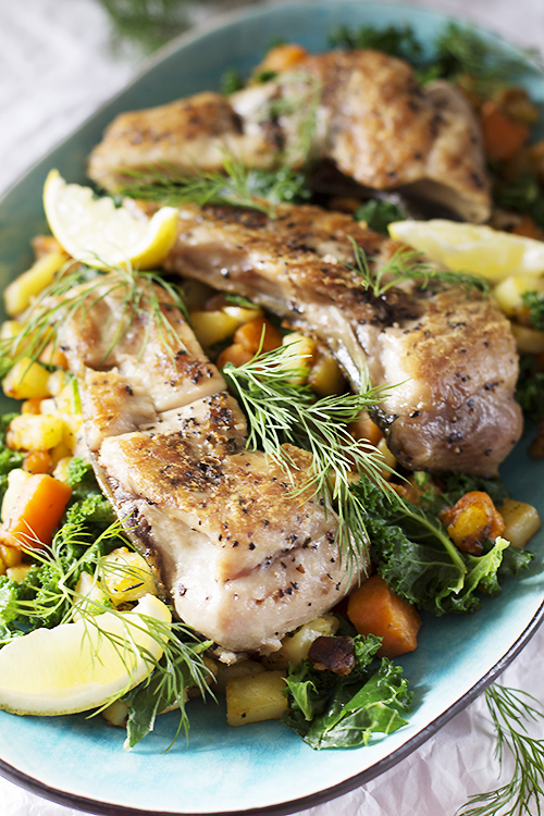 Czas wykorzystać świąteczne resztki! U mnie jak zwykle nić się nie zmarnuje. Zostało mi trochę karpia i jarmużu więc dzisiaj był szybki obiad. Ziemniaki, słodkie bataty i jarmuż to sałatka na ciepło podana do karpia z grilla. Na wigilię grillowałam karpia na grillowej patelni. Karp jest tłustą rybą i idealnie nadaje się na grilla. W tym roku mój miejscowy handlarz ryb naprawdę się postarał, bo oczyścił karpia prawie ze wszystkich ości na co zawsze moje dzieci narzekały.