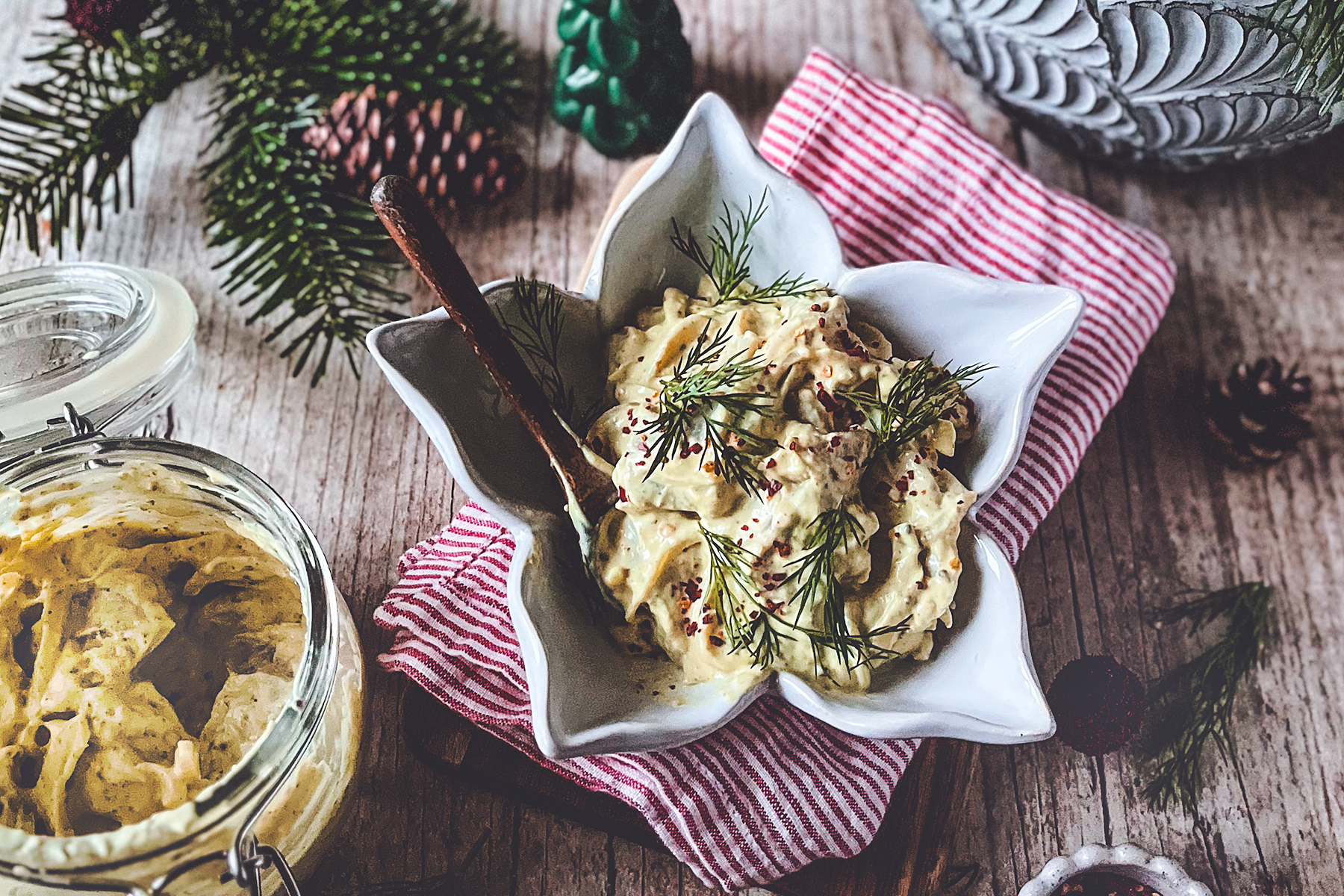 Bazą do tego przepisu jest prosty sos z crème fraîche, majonezu i musztardy. Warto dodać dwa rodzaje musztardy w tym gruboziarnistą. Z innych dodatków wybrałam tylko cebulę, którą wcześniej sparzyłam wrzątkiem, dzięki czemu jest delikatniejsza w smaku i nie dominuje całego dania. Na koniec doprawiłam sos pieprzem i curry, dodałam pokrojone na kawałki śledzie i dokładnie wszystko wymieszałam.