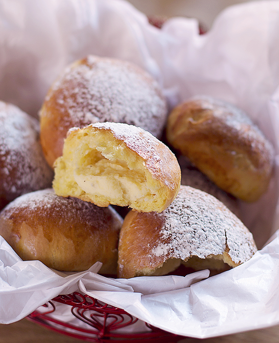 Gotowe ciasto podziel na 20 równych kawałków, u mnie około 60 gram każdy. Nadziej obficie waniliowym kremem, uformuj okrągłe bułeczki i ułóż na blasze wyłożonej pergaminem. Pozostaw do wyrośnięcia na około 30 minut. Piecz bułeczki na złoty kolor w piekarniku włączonym na termoobieg i 200ºC przez około 10 minut. Wyjmij z piekarnika i ostudź na metalowej kratce. Przed podaniem posyp cukrem pudrem.