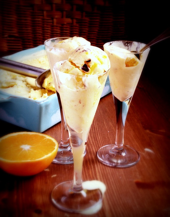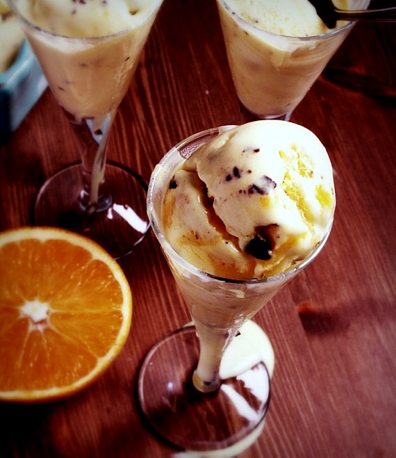Kiedy lody będą już prawie zamarznięte dodaj 100 ml pomarańczowego kremu i lekko przemieszaj.