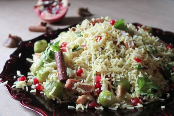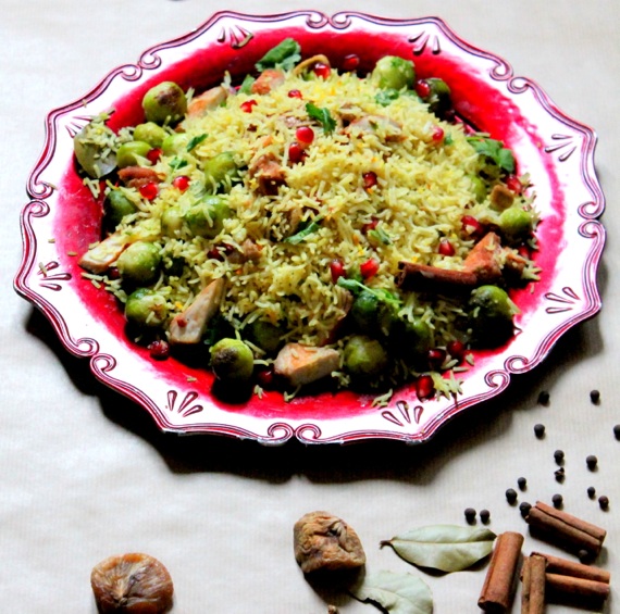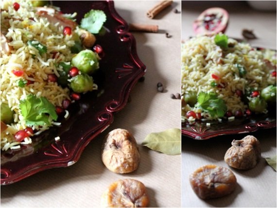 Szafranowy pilaf z kurczakiem, brukselka, figami i granatem