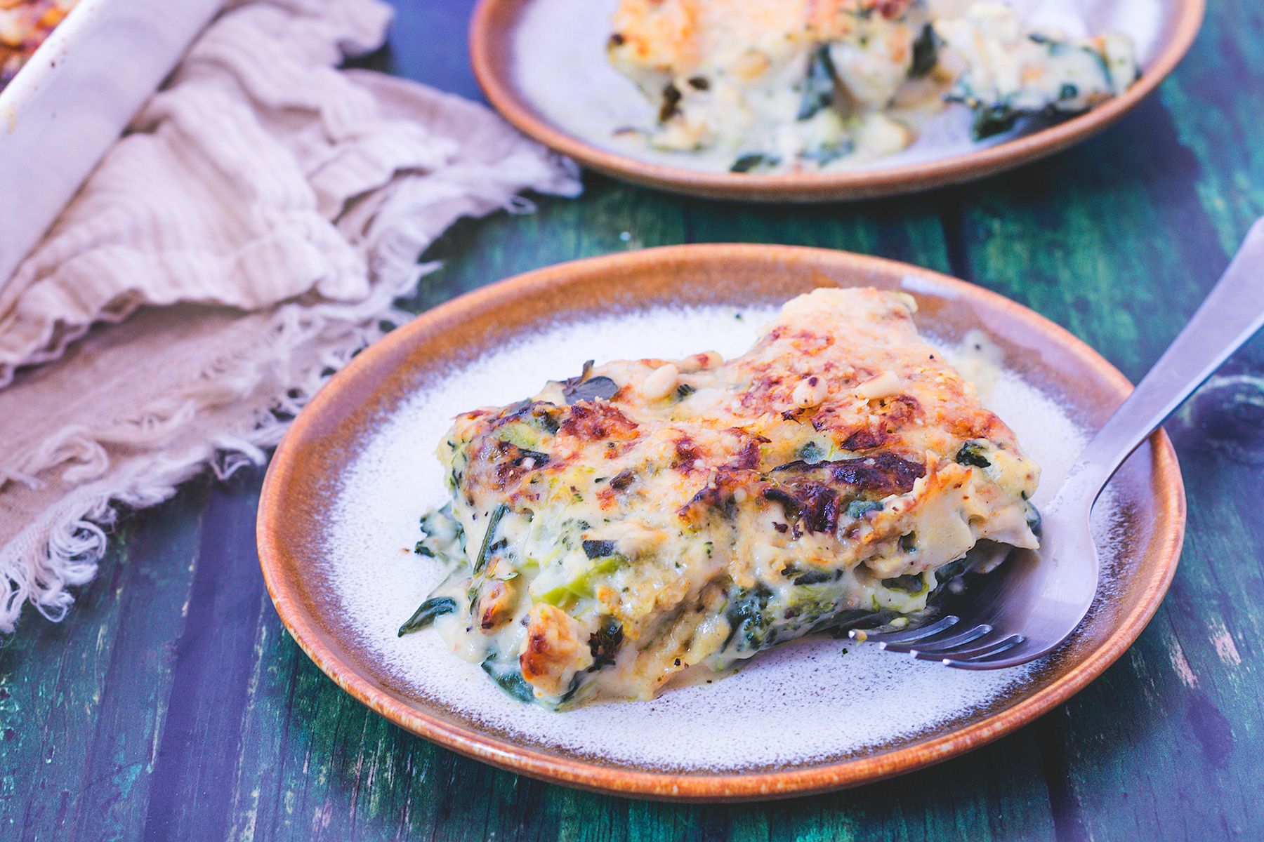 Szarpane lasagne z kurczakiem, brokułami i szpinakiem