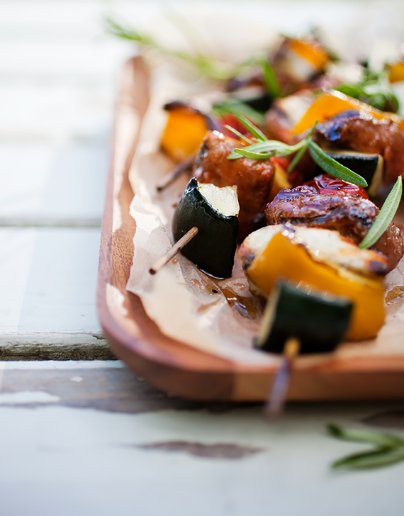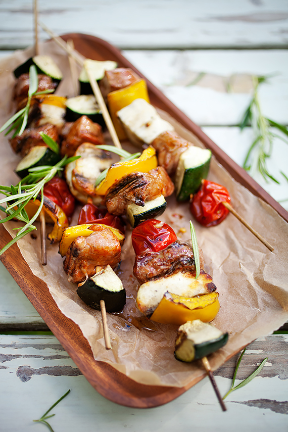 Pokrój mięso na w miarę równe kawałki. Wymieszaj składniki na marynatę, dodaj mięso, wymieszaj i marynuj przez godzinę lub pozostaw na noc w lodówce. Pokrój paprykę i cukinię w dosyć dużą kostkę. Wymieszaj z oliwą, pomidorami i przyprawami. Jeśli używasz drewnianych patyków do grilla namocz je w wodzie przed użyciem. Nadziej mięso na przemian z warzywami i grilluj przez około 10 minut odwracając na drugą stronę. Podczas grillowania wrzuć gałązki rozmarynu na rozrzażony węgiel. Szaszłyki będą jeszcze bardziej aromayczne.