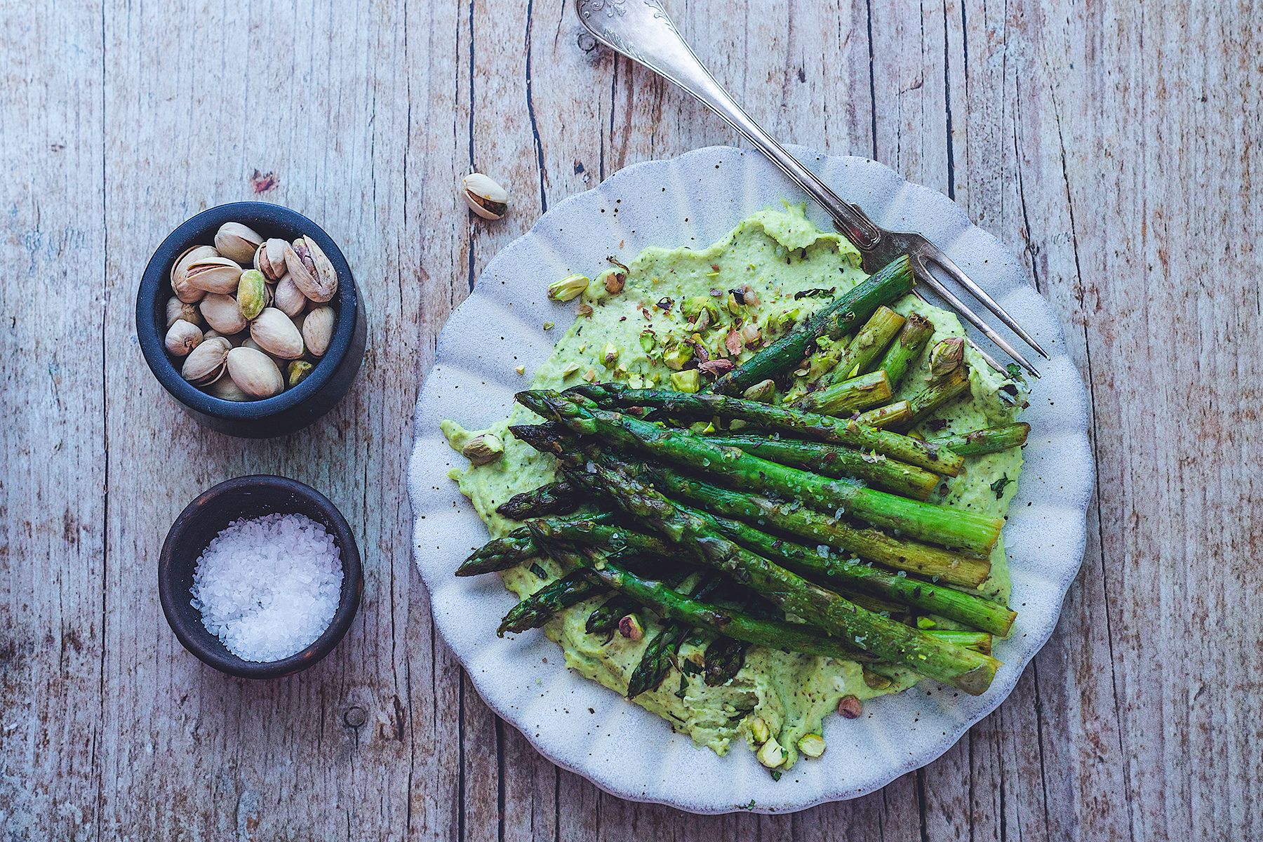 - Rozgrzać patelnię grillową. Szparagi usmażyć na dużym ogniu – powinny być al dente. Na talerzu rozsmarować krem, ułożyć na nim gorące szparagi. Całość posypać pistacjami i świeżą miętą (opcjonalnie). Smacznego!