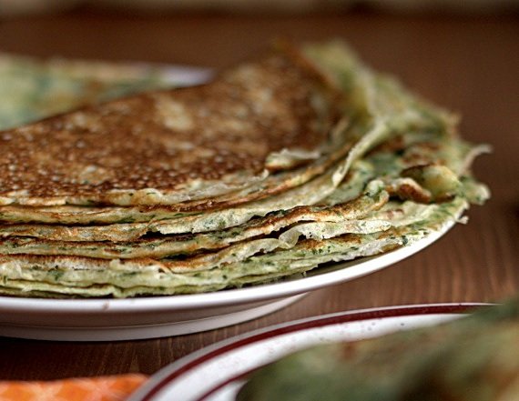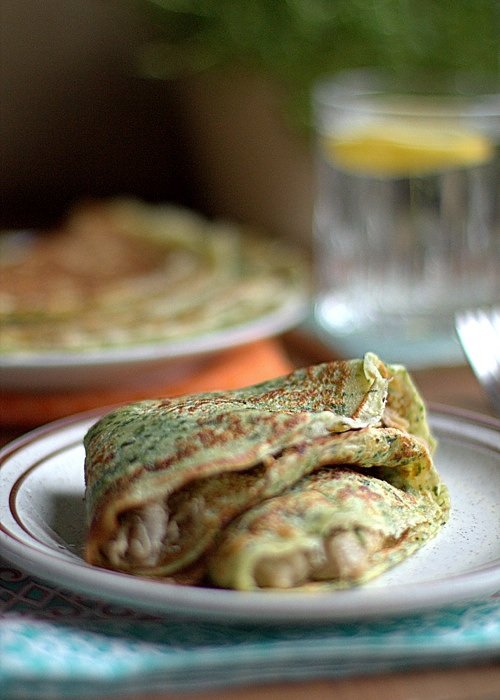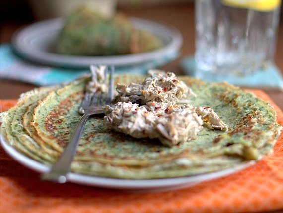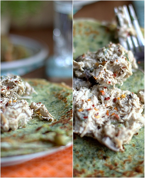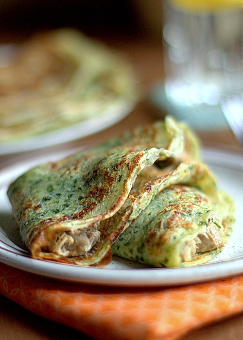 Szpinak i kurczak często występuje w moich przepisach. Nadziewane naleśniki z kurczakiem i szpinakiem prezentowałam tu niedawno. Dzisiaj dla urozmaicenia usmażyłam szpinakowe crepes, które nafaszerowałam pyszną sałatką z kurczaka.