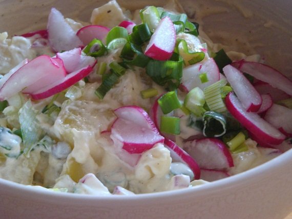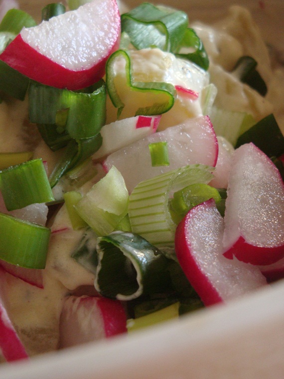 Dzisiaj, kochani blogerzy i czytelnicy mojego bloga przedstawiam wam typowo letnią sałatkę ziemniaczaną ze szczypiorkiem, dymką, rzodkiewkami i młodymi ziemniakami w roli głównej.