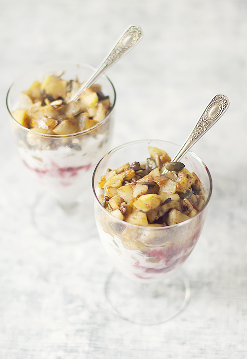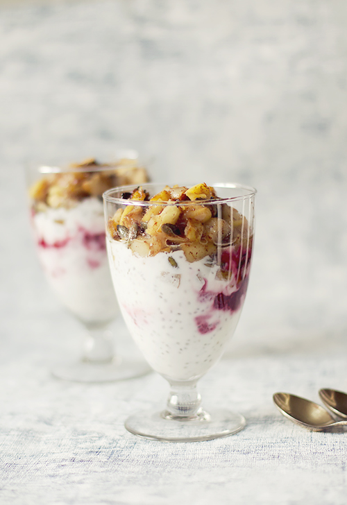 Wymieszaj jogurt z chia. Wstaw do lodówki na godzinę lub na noc. Jabłka i gruszki pokrój w kostkę i podsmaż na kokosowym oleju. Zrumień dynię i słonecznik na suchej patelni. Dodaj cynamon, a następnie usmażone owoce. Wymieszaj maliny z miodem i zagotuj. Napełnij szklanki chiajogurtem na przemian z malinami. Na wierzchu ułóż cynamonową mieszankę. Poda od razu do zjedzenia.
