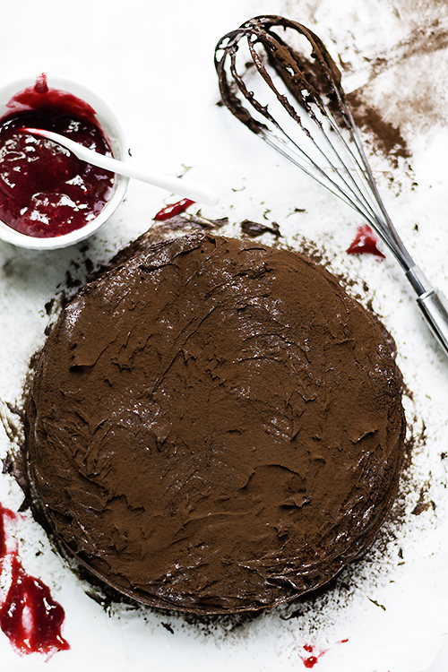Namocz żelatynę w wodzie przez 20 minut. Zagotuj maliny z cukrem. Przetrzyj maliny przez sito. Podgrzej dodaj żelatynę i zamieszaj. Odstaw mus do ostygnięcia. Kiedy zacznie zamarzać posmaruj wierzch tortu. Kiedy mus zastygnie, posmaruj brzegi i wierzch tortu kremem. Na koniec posyp kakao.