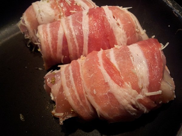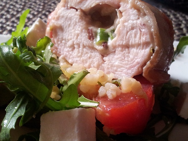 Roladki z kurczaka owinęłam w cienkie plasterki bekonu i usmażyłam na patelni bez dodatkowego tłuszczu. Danie to jest bardzo syte i dlatego jako dodatek do niego proponuję sałatkę z bulgur.
