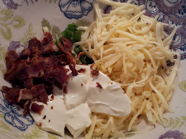 - 3 cienkie paski bekonu, usmażone i rozdrobnione + 100 g