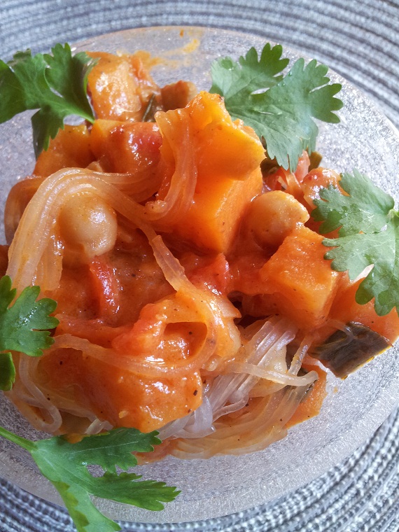 Uwielbiam ten przepis na curry, bo mogę go zmieniać jak tylko chcę. Na obiad wybrałam wegetariańską wersję ze słodkich ziemniaków czyli batatów i ciecierzycy. To wegetariańskie curry to połączenie słodkiego smaku z ostrym, które nieco łagodnieją, kiedy podaję curry z nudlami vermicelli.
