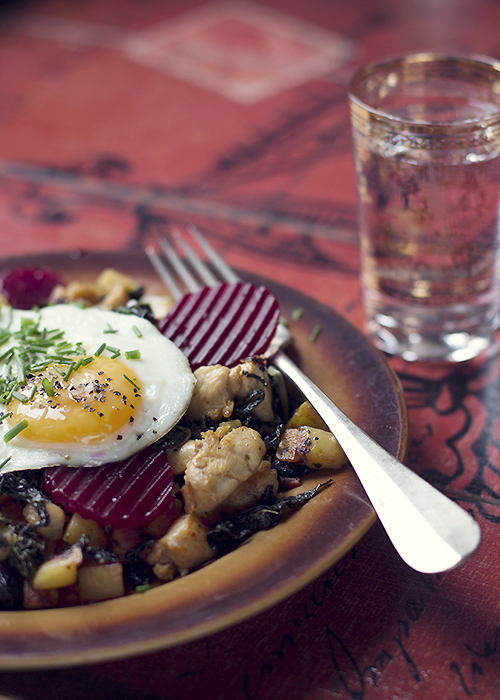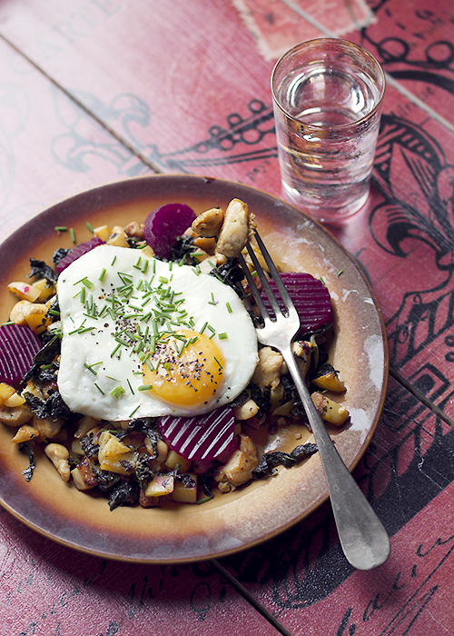 Święta już tuż, tuż! W przedświątecznym harmiderze polecam szybki i tani obiad, bo wiem, że jak ja nie macie zbytnio dużo czasu na gotowanie, a jeść przecież trzeba…Nikt nie mówi , że mamy pościć cały Adwent! Przygotowałam dla Was przepis na ziemniaczaną sałatkę z kurczakiem i czarną kapustą na ciepło, a korzystając z tego przepisu uświęciłam danie sadzonym jajkiem i marynowanymi buraczkami. Szybko, tanio i pysznie!