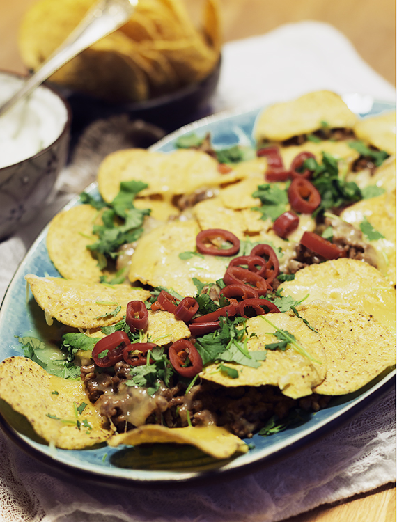 Pokrój cebulę i czosnek w kostkę. Zeszklij na oliwie. Dodaj mięso i przecier. Uprażone nasiona zgnieć w moździerzu i dodaj do mięsa z resztą przypraw i wodą. Smaż przez 5 minut. Rozgrzej piekarnik. Przełóż mięso na półmisek, obłóż nacho i posyp serem. Wstaw do nagrzanego ale wyłączonego piekarnika. Po 5 minutach lekko rozpuszczony ser będzie ciągnący. Posyp danie świeżo pokrojoną chili i kolendrą. Jako dodatek podaj jogurt doprawiony sokiem z limonki, miodem i świeżą kolendrą.