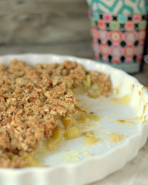 - Wymieszaj gruszki i rabarbar z cukrem i mąką ziemniaczaną. Wyłóż do formy i rozprowadz równomiernie. Przykryj owoce kruszonką. Piecz w piekarniku na 175ºC (termoobieg) przez 30 minut.