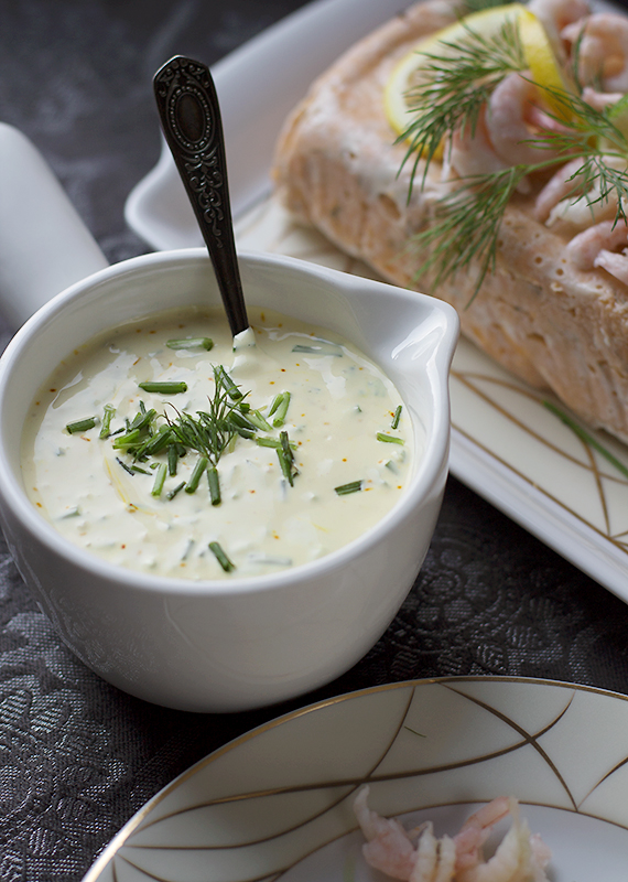 Rozpuść szafran w soku z pomarańczy i cytryny. Zmiksuj żółtka z musztardą i octem. Miksuj dalej wlewając po odrobinie oleju. Dopraw majonez solą i zmiksuj jeszcze raz. Do sosu wykorzystałam cały majonez. Dodaj teraz sok z pomarańczy i cytryny, szczypiorek, creme fraiche i wymieszaj.
